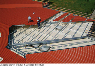 La scuola L.Valli di Narni è un caso esemplare di come sia possibile risolvere definitivamente i limiti delle coperture piane impermeabilizzate, trasformando quest’ultime, in maniera facile e efficiente, in tetti a falde ventilate. Le operazioni di messa in opera partono dal fissaggio sul solaio di elementi metallici di ripartizione del carico e su questi i sostegni telescopi regolabili per la creazione delle pendenze (Certificato Istedil n. 0871/2000-A). Successivamente i sostegni si dispongono in un apposito alloggiamento con sistema di aggancio rapido per l’ancoraggio dei profilati ad omega che sosterranno la copertura (il sistema è calcolato secondo la normativa vigente DM 09/01/96 e 16/01/96). Per migliorare la coibenza è possibile, come in questo caso, posare un materiale isolante, rigido o in rotoli. Prossima operazione è la realizzazione di canali di gronda perimetrali raccordati ai discendenti esistenti. Infine le lastre Coverib, giunte in cantiere già a misura, vengono fissate alla struttura, appositi estrattori e raccordi ventilanti in colmo e gronda permettono un costante ricambio d’aria nell’intercapedine. I lucernai esistenti vengono rialzati e raccordati al nuovo piano di copertura con apposite lattonerie. La copertura a bassa pendenza non altera la volumetria e i prospetti dell’edificio e contemporaneamente le proprietà di insonorizzazione e fonoisolamento garantiscono eccellenti prestazioni da parte di Ventilcover.