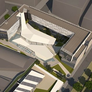 L’edificio esistente risale al 1946. Ampliato nel 1961, ha avuto una ristrutturazione con sopraelevazione nel periodo 1979-82. E’ giunto il momento di modernizzare la costruzione. Il progetto dello studio Transit ed Enzo Pinci prevede una contrapposizione tra il volume centrale più articolato e i volumi perimetrali regolari, intervallati da ampi spazi verdi.
