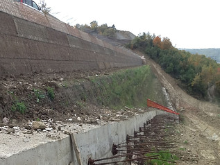 La soluzione originariamente selezionata in fase di progetto, consistente nella realizzazione di un muro di sostegno in terra rinforzata a contenimento di un rilevato con riempimento alleggerito in eps, posato all’interno di blocchi tirantati poggianti su una soletta in calcestruzzo, presentava alcun controindicazioni sia sotto il profilo della complessità esecutiva che della capacità di assicurare un adeguato drenaggio delle acque piovane.