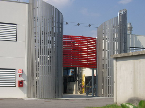 Il tamponamento esterno è in doghe di alluminio ancorate a sottostruttura in ferro zincato, mentre la finitura è realizzata con zincatura a caldo e le doghe di alluminio verniciate a polveri.