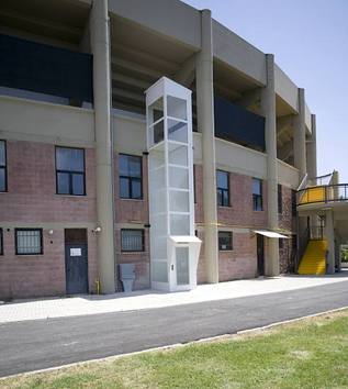 Easy lift è un elevatore in grado di coprire un dislivello fino a 11 m. La struttura realizzata allo stadio di Grosseto è un elevatore di 6,5 m che, grazie alla sua struttura autoportante ed all’assenza della fossa, garantisce un impatto architettonico minimo e la combinazione ideale con il contesto ambientale.