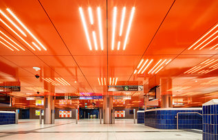 Il vasto soffitto illuminato della biglietteria centrale costituisce uno dei principali elementi di design del nuovo livello di accesso della stazione di Marienplatz. I pannelli color rosso-arancio e altamente riflettenti del soffitto danno un'impressione di estrema spaziosità. Inoltre, a filo del soffitto sono stati installati oltre 1.000 nastri LED Osram, caratterizzati da diverse lunghezze e disposizioni. Questi dispositivi di illuminazione LED appositamente progettati da Osram non soltanto creano un'atmosfera piacevole, ma catturano anche l'attenzione. Un altro centinaio di luci LED piatte di Osram garantisce un'illuminazione uniforme su cartelli ed emettitrici di biglietti.