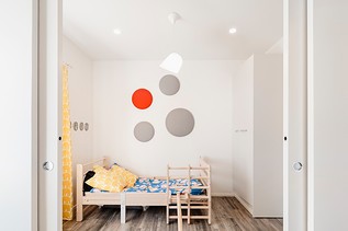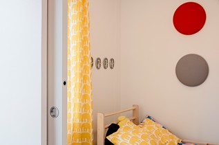 I bambini dormono ora nella stessa stanza ma grazie ad una doppia porta scorrevole è possibile creare due spazi separati: la camera da letto e la stanza dei giochi. Fra qualche anno, quando vorranno stare in due ambienti separati, la porta scorrevole riuscirà a garantire privacy ma anche la possibilità di muoversi e comunicare.