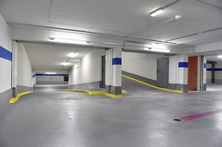 • Con il sistema di impermeabilizzazione Triflex CPS-C +, gli esperti di ristrutturazione hanno creato una protezione superficiale per l'area di parcheggio più bassa. Questo sistema è altamente resistente allo scivolamento grazie allo spargimento di sabbia quarzosa e protegge le superfici dei piani di parcheggio dagli effetti causati da acqua di condensa portata all'interno dai veicoli, sali, benzina e olio.