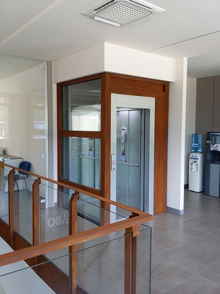 Cotabo ha scelto un ascensore per interni con struttura in vetro trasparente naturale e lato guida in lamiera verniciata.