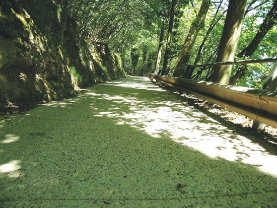 La finitura superficiale della strada, è stata realizzata quindi in parte in ghiaino, riproponendo la situazione attuale, e, in parte, con la pavimentazione architettonica Pieri® Chromofibre Vba, che, una volta acquisita nel corso degli anni una patina biologica naturale, avrà un aspetto simile a quello di uno stabilizzato naturale. Le campionature eseguite prima di iniziare i lavori hanno infatti permesso di realizzare un mix-design della finitura superficiale che si avvicina il più possibile ai colori naturali esistenti in loco. Come ogni intervento architettonico sui beni monumentali dovrà "invecchiare" e adattarsi ai luoghi, ma ciò ci consentirà, soprattutto per la porzione di strada più acclive, di ridurre notevolmente gli oneri legati alla manutenzione, sia in termini di tempo che, soprattutto, di costi.
