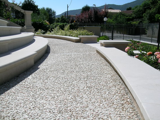 La pavimentazione dello spessore di 8 cm è stata realizzata con due tonalità cromatiche “chiaro – scuro”: per la parte chiara sono stati utilizzati gli aggregati Bianco Verona e Rosa Corallo, per la parte scura il Bianco Verona, Rosa Corallo e Giallo Mori. L’arredatrice che ha curato la progettazione della pavimentazione, l’arch. Roberta Lorenzoni, ha scelto il sistema Levocell in quanto ritenuto adatto al contesto della villa, prevalentemente in marmo di Botticino. Il sistema è stato utilizzato anche per la realizzazione della rampa di acceso al garage dallo spessore 10 cm e rafforzata mediante l’utilizzo di una rete elettrosaldata.