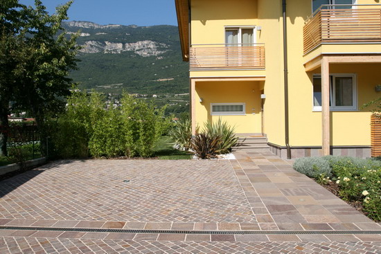 Le pavimentazioni esterne, i vari rivestimenti e le scale di accesso dell'edificio progettato con i criteri della bioedilizia, sono state realizzate con un prodotto nobile e duraturo, ideale per l'ingresso pedonale e carrabile della casa.