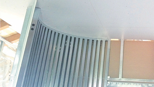 La finitura del guscio interno è composta da una superficie in doppia lastra di gesso rivestito A13 applicata ad un orditura metallica leggera retrostante. Tale superficie conferisce al pacchetto caratteristiche igrotermiche notevoli, grazie alla capacità del gesso rivestito di comportarsi da “volano igrotermico”. L’orditura metallica che funge da ancoraggio del rivestimento è composta da tre diversi elementi: profili pressopiegati a freddo in acciaio zincato autoportanti distinti in “montanti a c” e “guide a U”; profili che ospitano in luce un prodotto coibente fibroso, ovvero un materassino composto al 100% da fibra