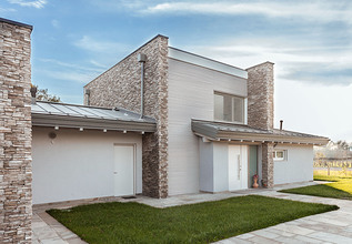 “Sopra la platea in calcestruzzo armato, la struttura antisismica a telaio in legno consente di massimizzare l'efficienza energetica, senza rinunciare a un'immagine moderna che alterna con sapienza candidi volumi orizzontali, rifiniti con intonaco e doghe in legno, con setti verticali rivestiti in pietra e tetti a falde. Gli ambienti principali si sviluppano al piano terreno, attorno alla zona giorno a doppia altezza, disposti secondo il tragitto del Sole che li inonda di luce grazie alle ampie superfici trasparenti, fisse e apribili, protette da frangisole mobili ad azionamento elettronico. Gli spazi di servizio, rivolti a nord e a ovest, dispongono invece di aperture più piccole. La corretta gestione degli apporti solari, l'elevato livello di isolamento termoacustico dell'intero involucro e la scelta di soluzioni per la climatizzazione di ultima generazione hanno portato a un edificio estremamente salubre e parco nei consumi, certificato in classe energetica A+.”